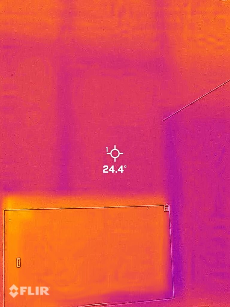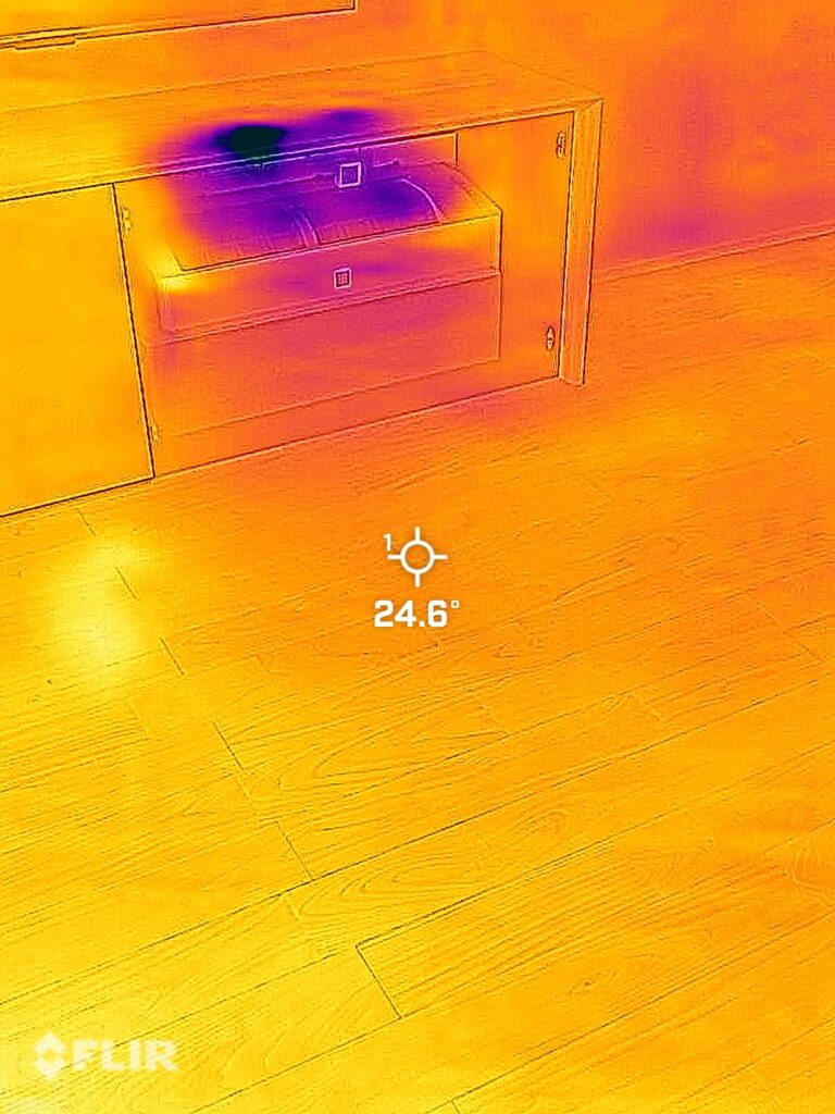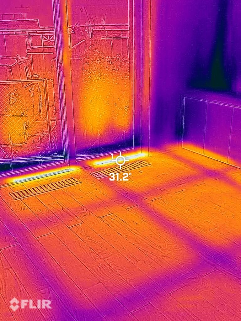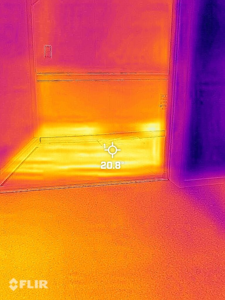 室温が安定していない状態でのサーモグラフ。お風呂の床まで暖かく、もはや全館床暖房状態です。