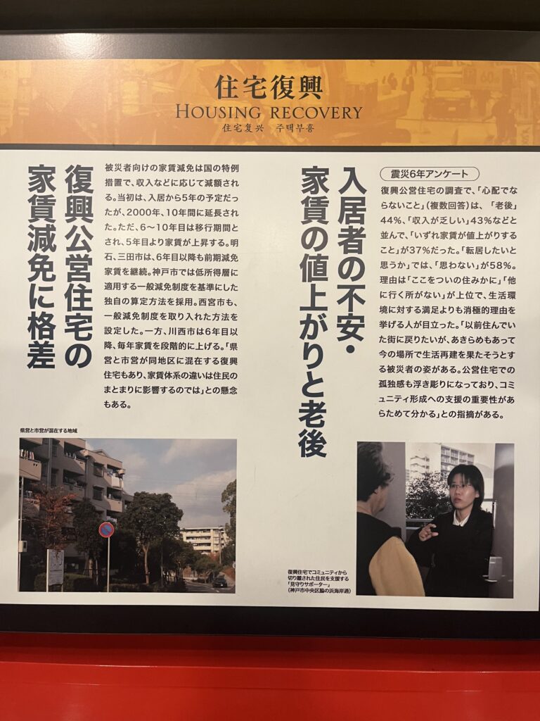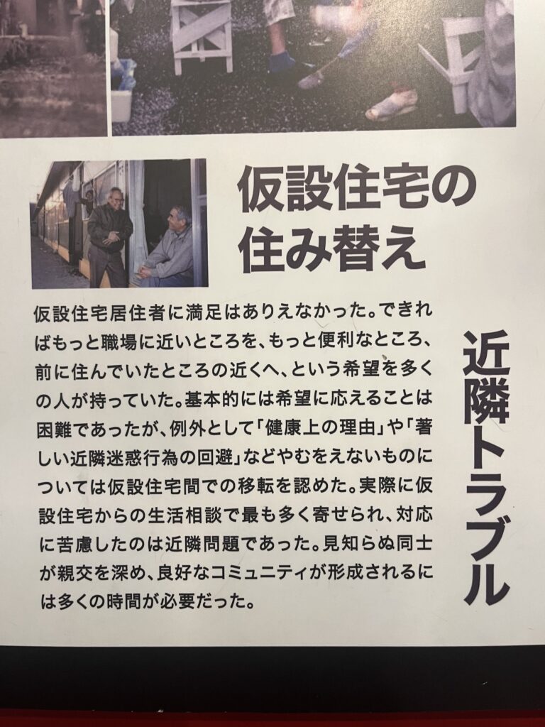 仮設住宅での生活についての展示も印象的でした。生活相談で最も多く寄せられたのは、意外にも近隣トラブルだったそうです。慣れない環境、強いストレス、不安な気持ち。良好なコミュニティができるまでには、多くの時間が必要だったとのことです。