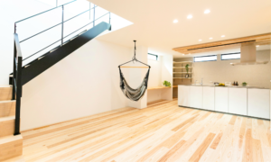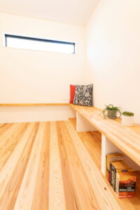 杉の無垢床は、素足にやさしい触感を届け、そのまま寝転がっても心地よいぬくもりに包まれる。